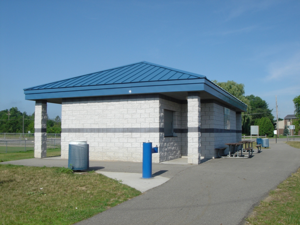 200 Depot Street Google Map This park has it all... sports, recreation, waterfront, walking trails, and a lovely pavilion, on five acres in the center of Belding on the Flat River. Amenities include two lighted tennis courts, basketball courts, two picnic shelters, a pavilion, restroom, a sand volleyball court, a ten station exercise trail, playground equipment, a skate park, soccer fields, drinking fountains, picnic tables, park benches, and a walk path.